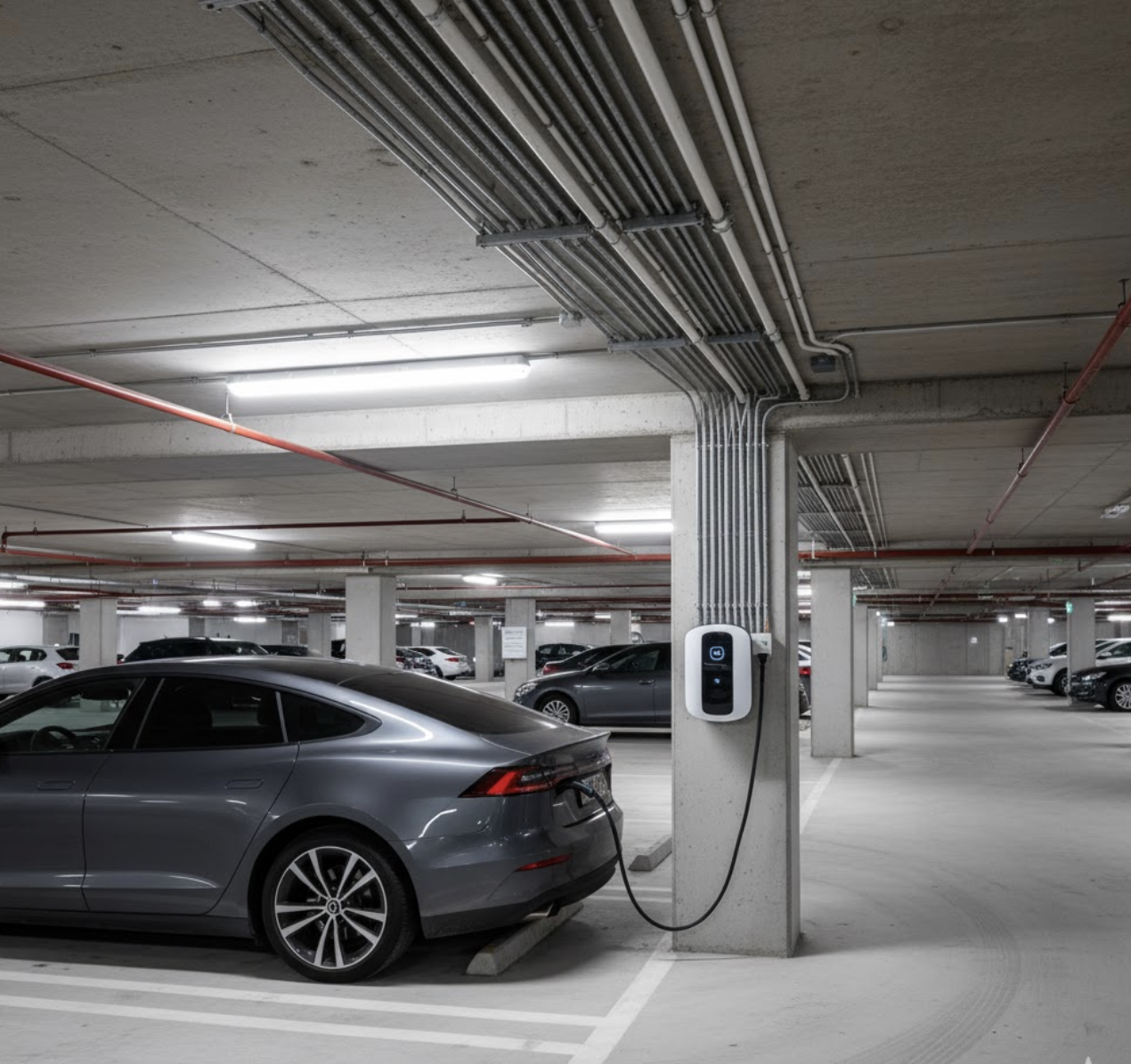 את הכבל אי אפשר סתם "לזרוק" בחניון. הוא חייב להיות מוגן בתוך תעלות PVC או צינורות מרירון קשיחים, ומקובע לתקרה או לקירות בצורה אסתטית ובטיחותית שלא תפריע לשכנים.